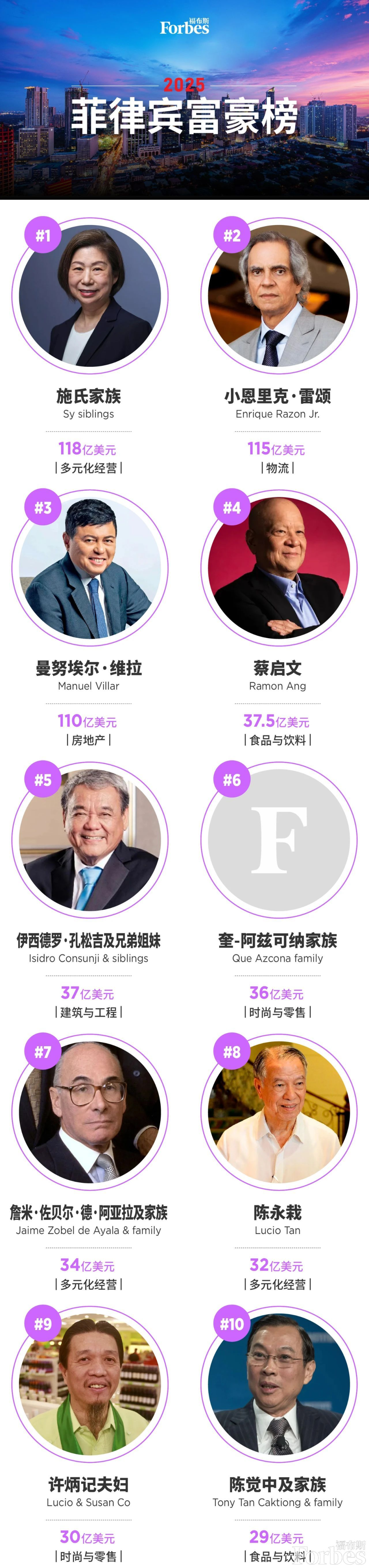 以2024年福布斯发布的菲律宾富豪榜为例,十人中有一半都是华人。