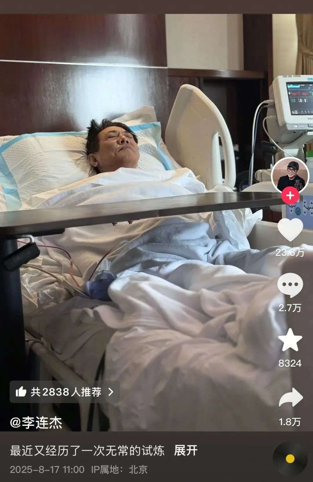 8月17日,李连杰在其社交账号上发布自己躺在病床上的照片,配文称“最近又经历了一次无常的试炼”。