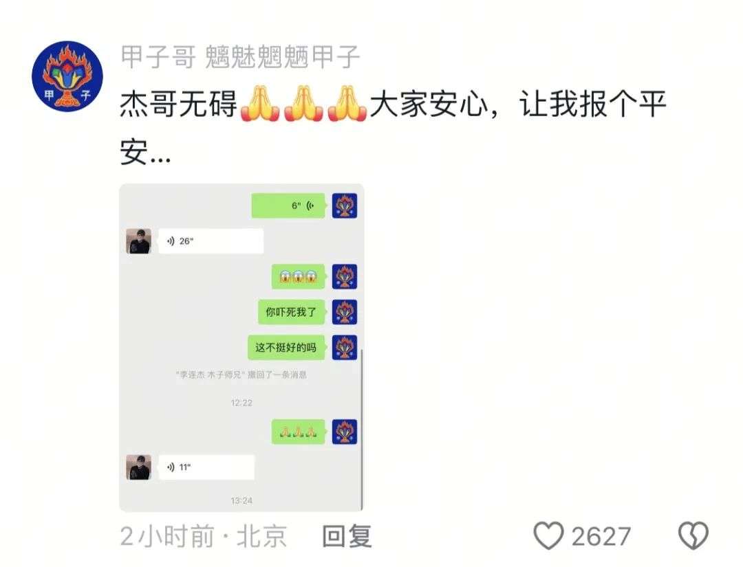 17日下午,据媒体报道,好友甲子哥在评论区晒出与李连杰聊天称,杰哥无碍,大家安心,让我报个平安。并还回复网友称,李连杰能吃能喝,很顺利,很快和大家见面。