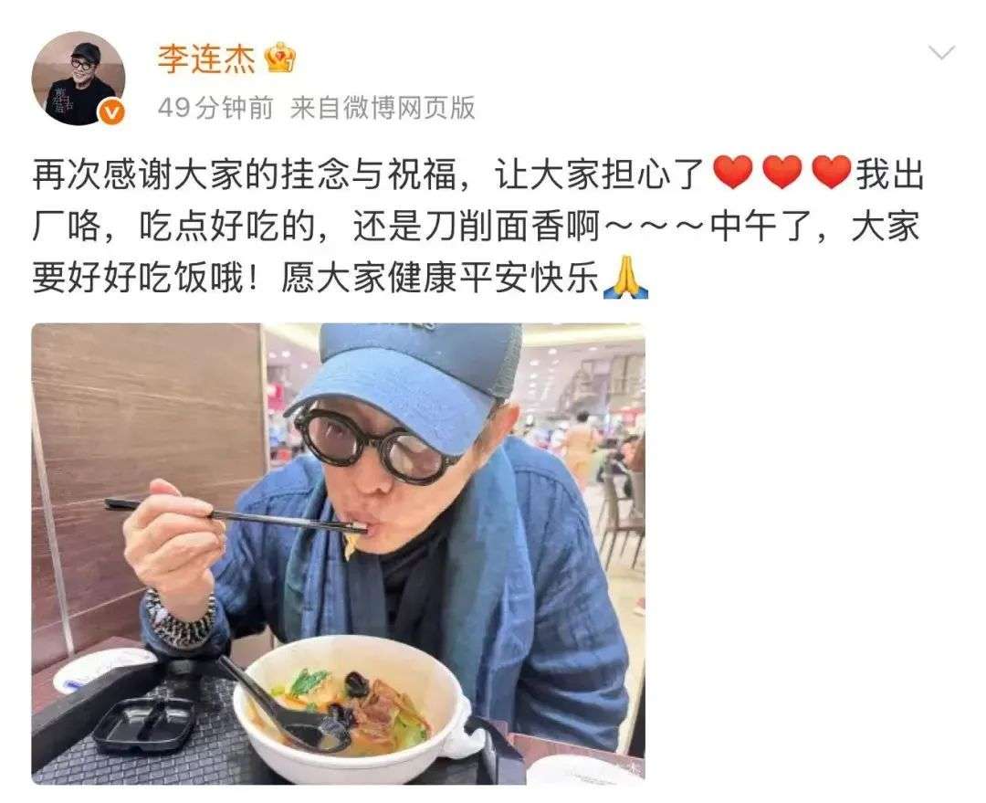 今天,李连杰出院后再报平安:再次感谢大家的挂念与祝福,让大家担心了,我出厂咯,吃点好吃的,还是刀削面香啊。中午了,大家要好好吃饭哦!愿大家健康平安快乐。