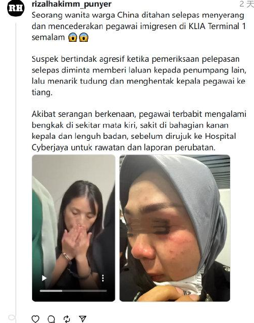 一名来自中国的女游客在出境时,因不满移民检查程序,竟突然情绪失控,当众辱骂移民官,还粗暴地扯下对方的头巾,并将其头部猛撞在柜台柱子上。移民官当场受伤,眼部肿胀,身体多处出现伤势。事件震惊该国,这名女子随后被捕并迅速提堂,最终被判处监禁与罚款。