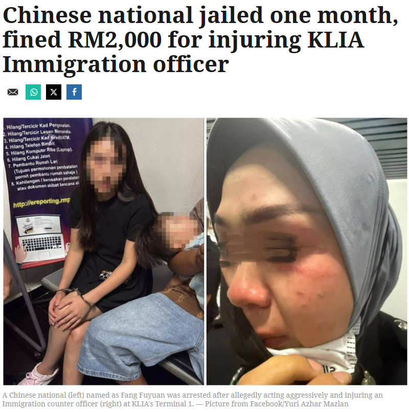 8月18日,这名中国女子被带上庭,身份也首次曝光——她名叫方富媛(Fang Fuyuan)。庭审过程中,她承认了控罪。根据马来西亚刑法第332条“故意伤害公务员”的相关规定,法院判处她一个月监禁,并处以2000令吉(约合3100人民币)罚款。