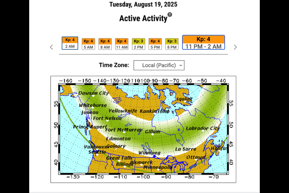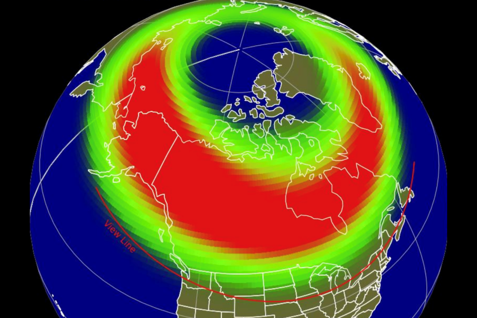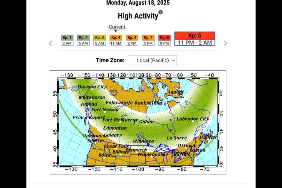 阿拉斯加费尔班克斯大学(UAF)预测,周一夜间将出现高强度的极光活动。从黄刀镇到伊魁特,从朱诺到埃德蒙顿,从温尼伯到雷湾,这些地区的上空都可能出现壮观的极光显示。