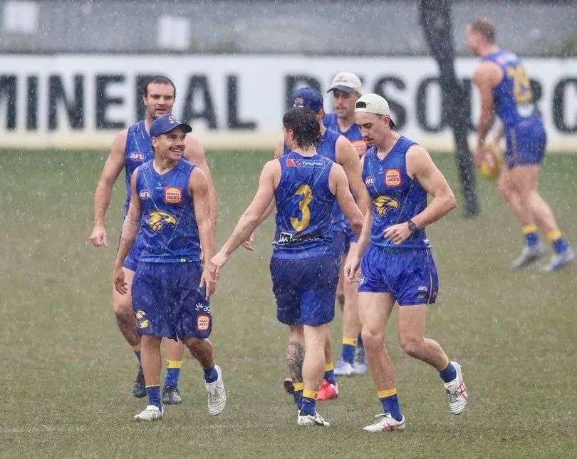 周二早上,西海岸老鹰队在训练中感受到了暴风雨的侵袭,这些 AFL 明星球员在雨中变成了湿鸟。