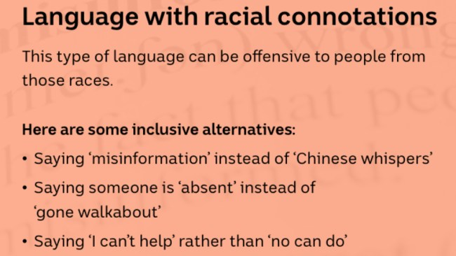 该课程的部分内容涉及避免使用“带有种族暗示的语言”,员工被告知一些短语可能会冒犯特定种族群体,并提供了更具包容性的替代用语。