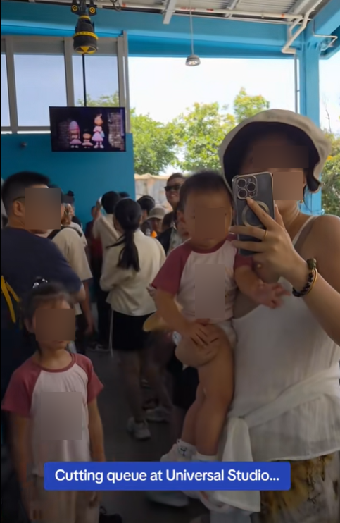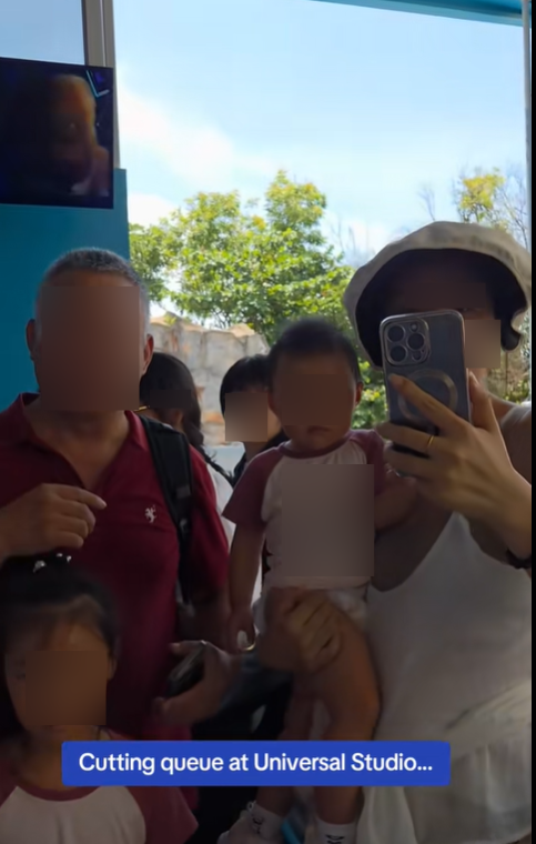 镜头的另一边,则是一位气愤不已的华裔男子。他给视频配上的字幕是:“Cutting queue at Universal Studios…(环球影城插队…)”,直接把矛头指向了这家人。