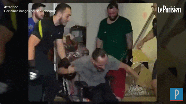 比如,拉斐尔坐在镜头前,同伴突然从他背后偷袭,用一块貌似石膏板的东西将他爆头。