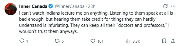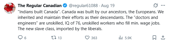 甚至,有位网友用非常种族主义的话语调侃道:“加拿大是由我们的祖先——欧洲人——建立的。作为他们的后代,我们继承并延续了他们的成果。‘医生和工程师’是智商只有76的非技术工人,从事着低薪工作。他们是自由党引进的新型奴隶阶级。”