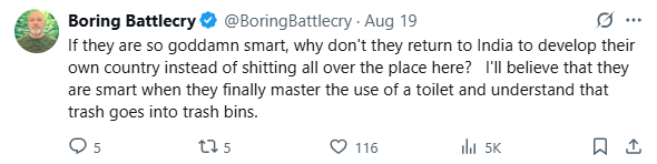 “如果你们真这么聪明,为什么不回印度发展自己的国家,而是在这里随地大小便?等你们最终学会使用厕所,明白垃圾要扔进垃圾桶,我才会相信你们聪明。”