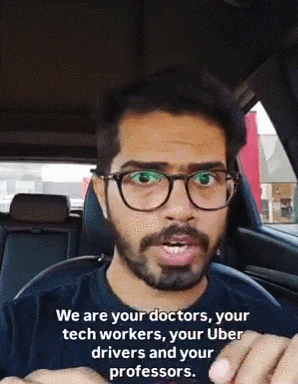 他举例说:“我们印度人是你们的医生,你们的技术工人,你们的uber司机,你们的教授,你们的小商家老板,以及你们的Tim Hortons员工。”
