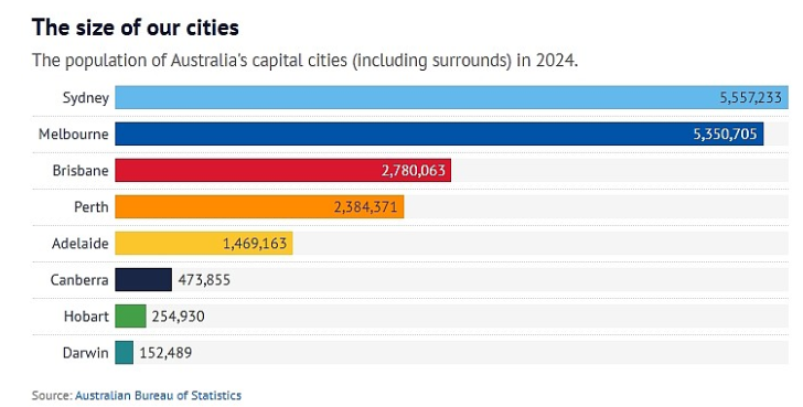 最新一次的人口数据显示,所有首府城市的人口总数为1840万人。截至2024年6月底的12个月内,悉尼新增了107500人,总数达到了创纪录的560万人。而墨尔本新增了142600人,总人口为540万人。
