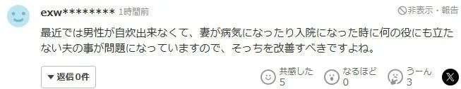 “最近出现了丈夫不会自己做饭,妻子生病或者住院时丈夫也帮不上忙的问题,这才是需要改善的。”
