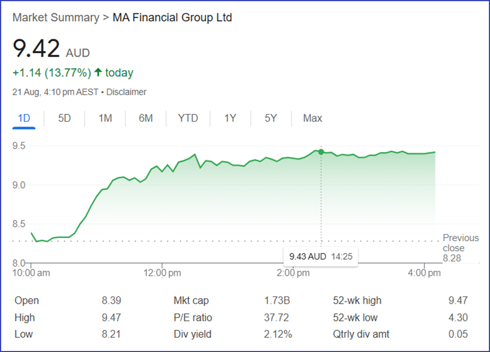 截至发稿时(2025年8月21日),美驰澳大利亚股价报收9.42澳元每股,单日上涨13.77%。