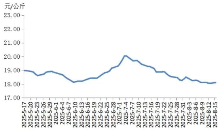 据农业农村部官网8月19日数据显示,2025年第33周(即8月11日~8月15日),16省(直辖市)瘦肉型白条猪肉出厂价格总指数的周平均值为每公斤18.08元,环比下跌0.8%,同比下跌34.8%,较上周跌幅扩大2.8个百分点。