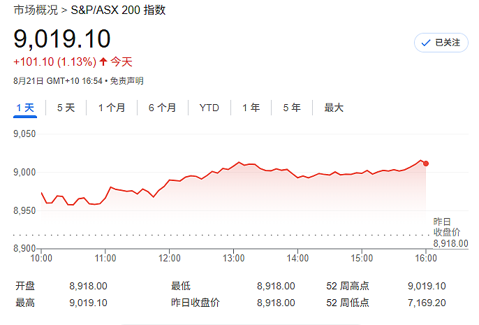 据《澳洲新闻集团》8月21日报道,澳洲股市延续强劲的上涨势头,再次刷新历史纪录,成功突破9000点大关,多个板块的涨幅迅猛,多个企业的业绩也超出了市场的预期。