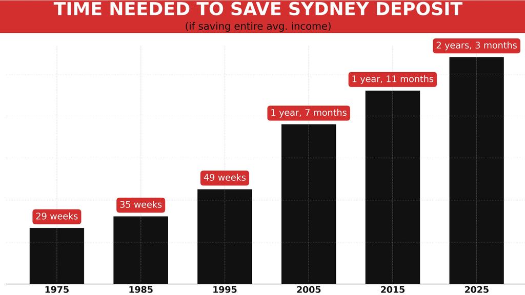 数据显示,以当前悉尼房价计算,即便将所有收入都用于储蓄,普通收入者攒够首付款的平均时间为121周,是1975年所需29周的四倍。