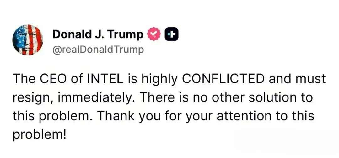 “因存在严重利益冲突,英特尔CEO必须立即辞职,这个问题没有其他解决办法。”北京时间8月7日晚,在事先毫无征兆的情况下,美国总统特朗普其所创立的社交平台Truth Social(真实社交)上突然发文,矛头直指今年3月才上任的英特尔新CEO陈立武。