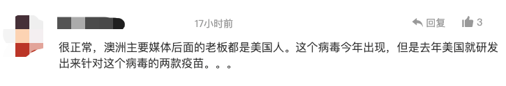 还有人直言:“很正常,澳洲主要媒体后面的老板都是美国人。这个病毒今年出现,但是去年美国就研发出来针对这个病毒的两款疫苗。。”