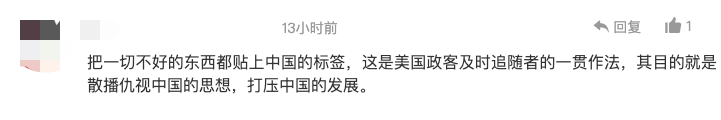 还有人表示:“把一切不好的东西都贴上中国的标签,这是美国政客及时追随者的一贯作法,其目的就是散播仇视中国的思想,打压中国的发展。”