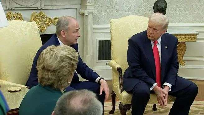 当地时间3月12日,美国总统特朗普在白宫会见爱尔兰总理马丁时似乎在右手手背上涂了化妆品。