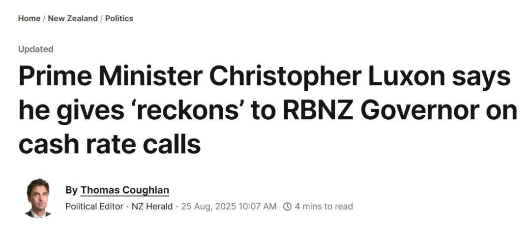 今天,媒体报道的标题是,Luxon会就利率决策向新西兰储备银行行长“提建议”。