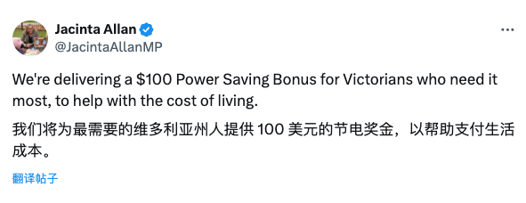 维州最新宣布,数百万居民将可申请领取100澳元的电费补贴(Power Saving Bonus),以缓解生活成本压力。州长Jacinta Allan在社交平台X上表示,该补贴申请已于周一正式开放。