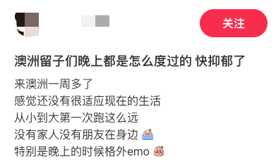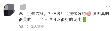 “刚到异国,孤独和不适应很正常~可以晚上听听歌、追追剧,或者和国内朋友聊聊,也能参加留子社群活动,慢慢就会找到属于你的澳洲小美好,你超勇敢的,适应期会过去哒。”