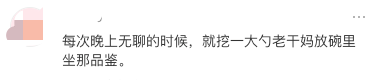 “每次晚上无聊的时候,就挖一大勺老干妈放碗里坐那品鉴。”
