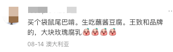 “买个袋鼠尾巴啃。生吃蘸酱豆腐。王致和品牌的,大块玫瑰腐乳。”