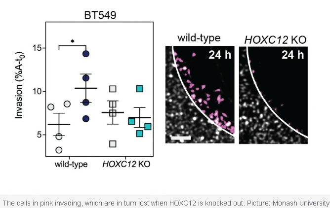 (粉色区域表示入侵细胞,当 HOXC12 被敲除时,这些细胞就会消失。图片来源:莫纳什大学)
