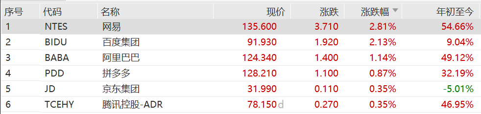 纳斯达克中国金龙指数收涨,万得中概科技龙头指数涨0.52%。网易、百度集团、阿里巴巴、拼多多纷纷收涨。昨夜拼多多发布二季度财报,单季营收达1040亿元,同比增长7%,盘前一度大涨超10%。