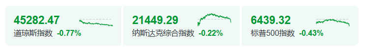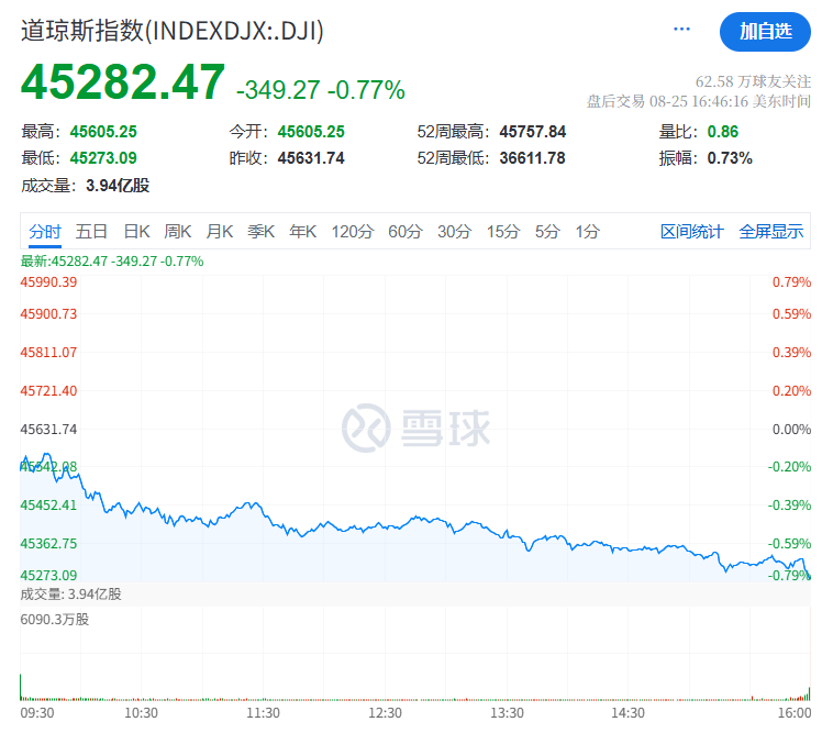 美东时间8月25日周一,美国三大股指全线收跌。截至收盘,道指跌0.77%,报45282.47点;标普500指数跌0.43%,报6439.32点;纳指跌0.22%,报21449.29点。