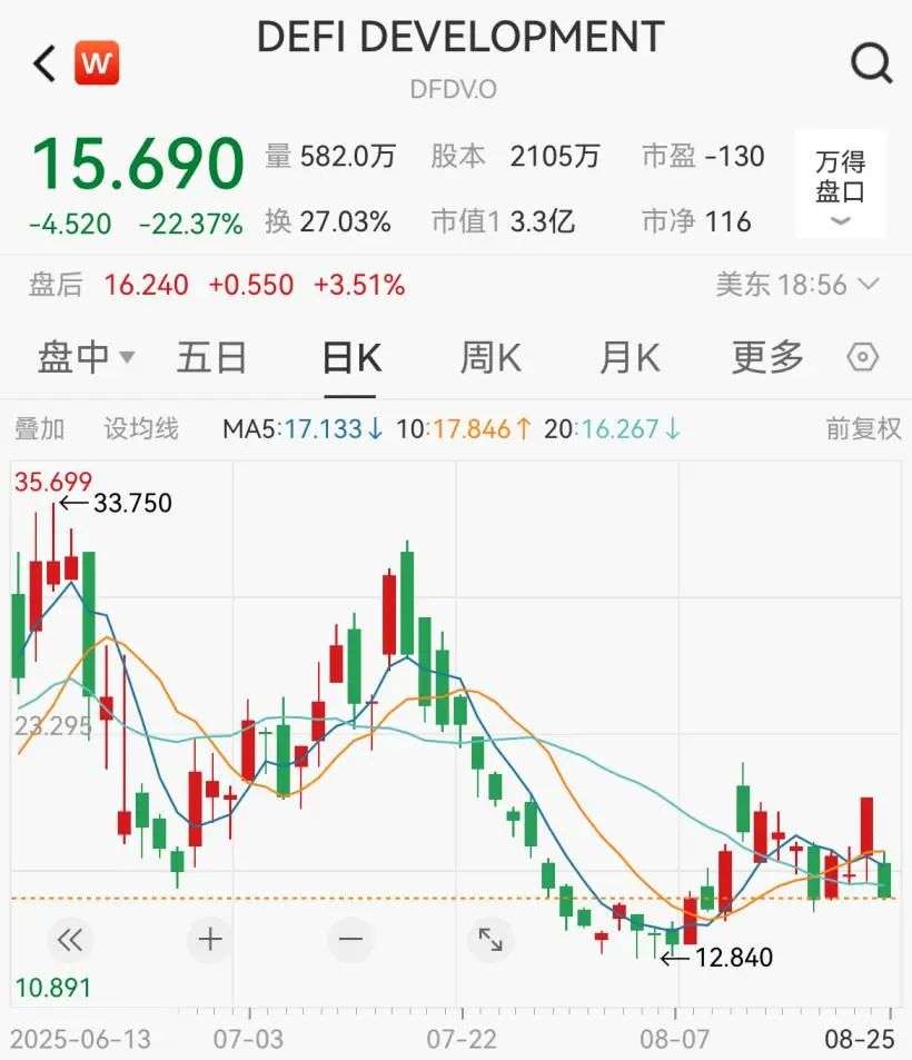 加密货币概念股集体下跌,DeFi Development大跌超22%。