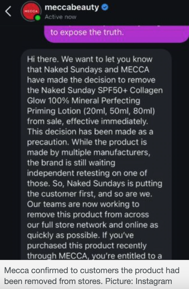 值得注意的是,消费者最先发现这款产品已经 从美妆零售商 MECCA 的货架上消失,社交媒体上更流传出客服截图,确认产品已被下架。部分顾客甚至呼吁零售商“公开真相”。与此同时,Ultra Violette 也因旗下 Lean Screen 防晒多次检测结果差异巨大(最低竟只有 SPF4),宣布即刻全面撤市,并向消费者致歉。