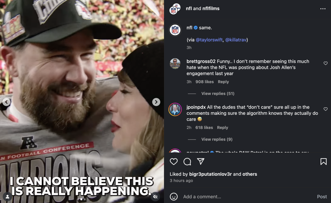 NFL 官方账号则发布了两人超级碗胜利后相拥的片段,背景是满天彩带。