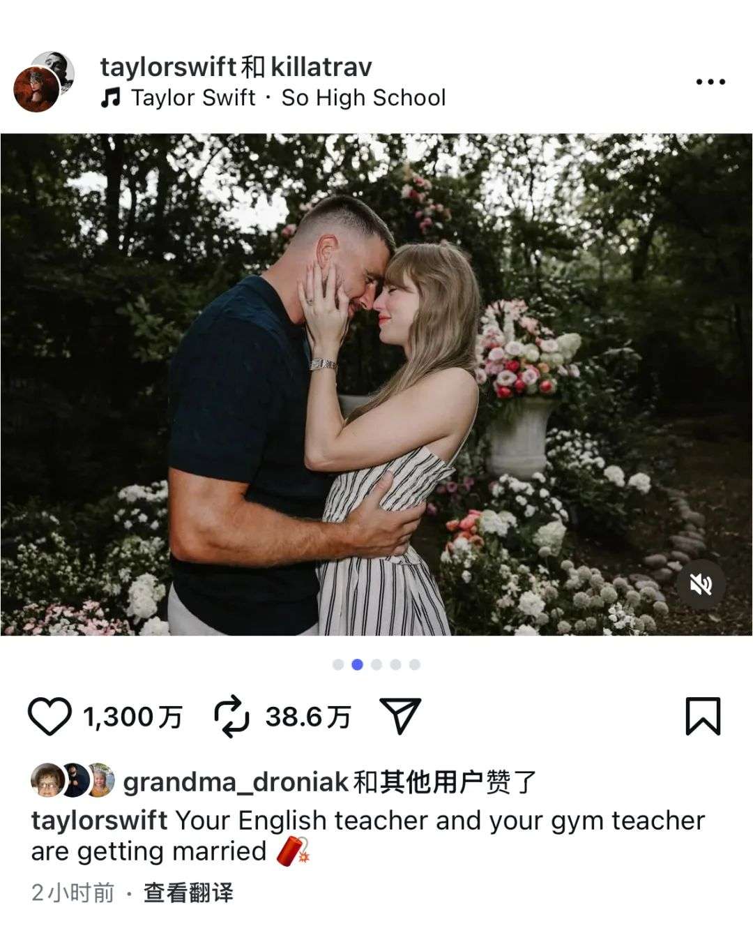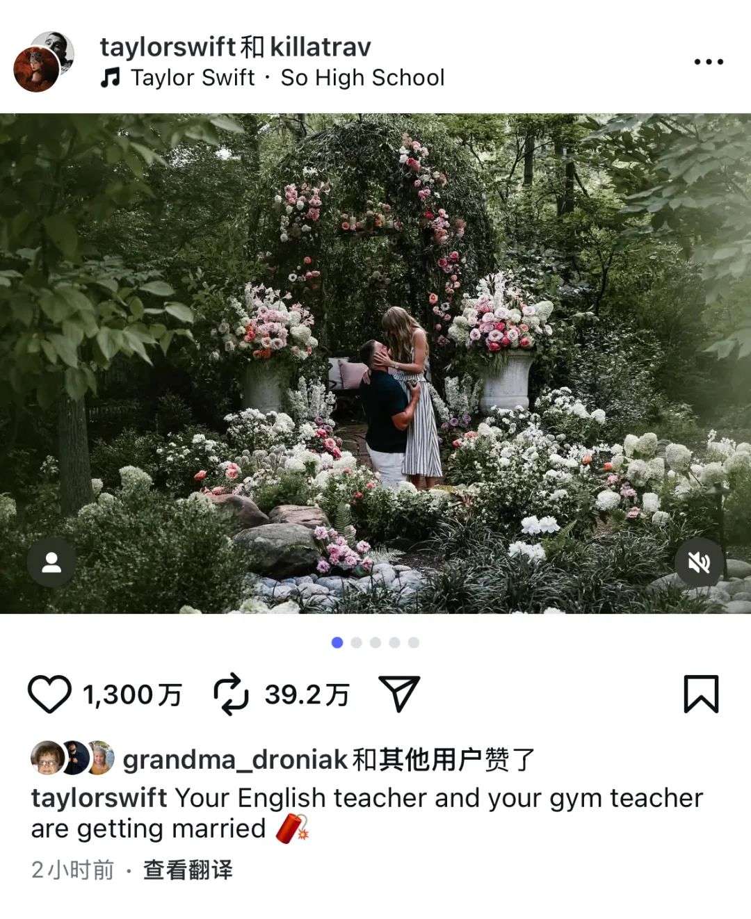 霉霉在Instagram晒出五张照片,配文写下俏皮的一句:“Your English teacher and your gym teacher are getting married ”(你的英语老师和体育老师要结婚了)