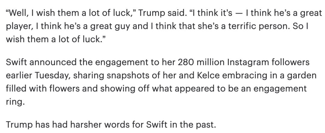 他在白宫表示:“我觉得凯尔西是个很棒的球员,也是个好人。泰勒也很出色,我祝他们好运。”