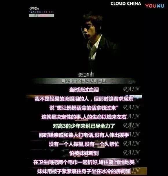 因为妈妈患有糖尿病,Rain 从小就一边上学一边帮妈妈买年糕。等到上高中时,爸爸又因为生意失败让全家陷入困境,不得不跑到国外打工还债。就这样,没有背景、无所依靠的他,十几岁就咬着牙在残酷的娱乐圈里摸爬滚打,求一个崭露头角的机会。