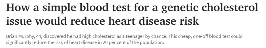 有确凿证据表明,水平升高是心脏病发作、中风和心血管死亡的高风险因素。证据还表明,一生中只需一次20至30澳元的检测,就可以拯救生命,节省医疗系统和社会成本。