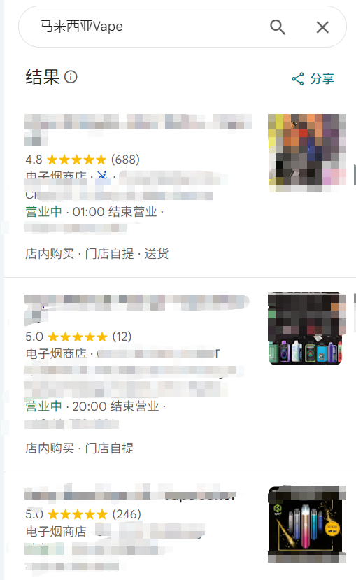 在谷歌地图上只要输入Vape等关键词,可以轻而易举地搜到相关商店,走在新山的闹市区也可以看到卖电子烟的商店(但并不会在门牌上明示出售电子烟)通常这类商店装修明亮、门口设有安全门,需经许可后才能进入。