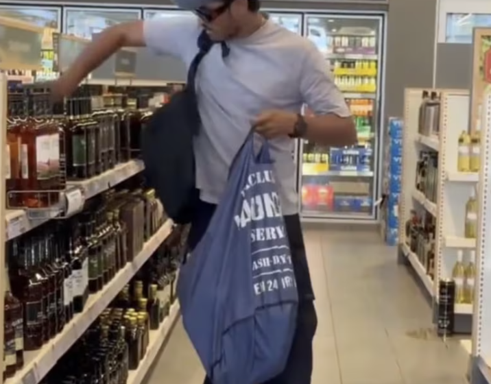 只见6名男子结伴走进店里,目标明确,径直走向烈酒区域,开始将高档威士忌和苏格兰酒大把大把地塞进大号手提袋。