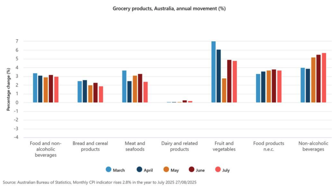 澳洲家庭再次面临生活成本冲击。最新数据显示,通胀水平意外反弹,令市场对央行进一步降息的期待几乎落空。澳大利亚统计局(ABS)公布,7月消费者物价指数(CPI)同比上涨2.8%,不仅高于6月的1.9%,更触及澳储行(RBA)设定的2%至3%目标区间上限,是过去12个月以来的最高水平。