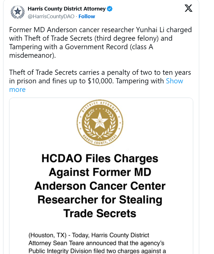 针对李的逮捕事件,MD安德森癌症中心在声明中回应,李已不再受雇于该中心,并表示中心正配合进行调查。