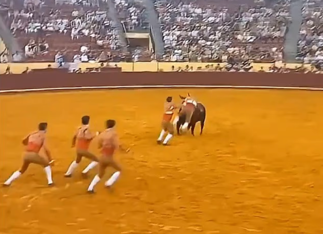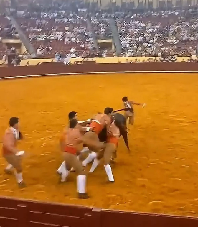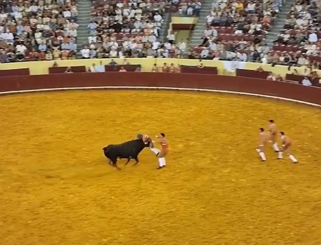 他被扔向半空,然后重重地撞向坚硬的斗牛场围墙!
