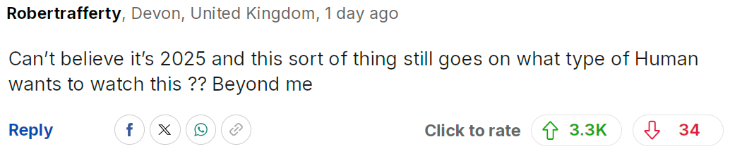这种令人作呕的虐待动物行为必须停止,在一个文明社会里根本没有立足之地。