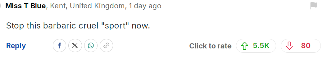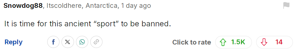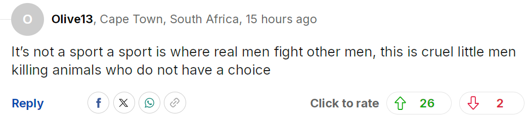 但这根本不是运动好吗。真正的运动是男人与男人之间的较量,而这里却是一些懦弱的小人残忍地杀害毫无选择权的动物。