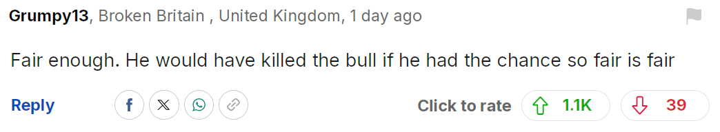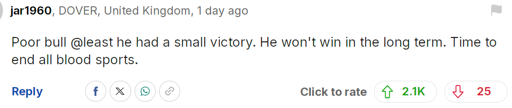 可怜的公牛,至少这一刻它算是赢了一小场胜利。可惜从长远来看它终究不会赢。是时候彻底结束一切血腥的“运动”了。