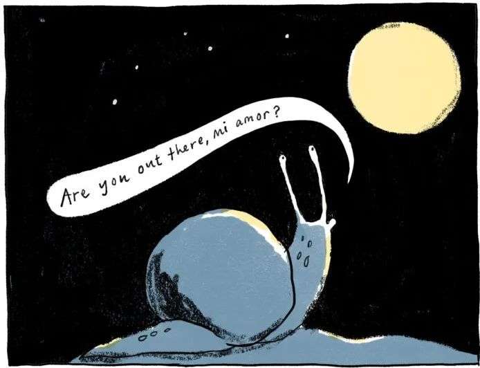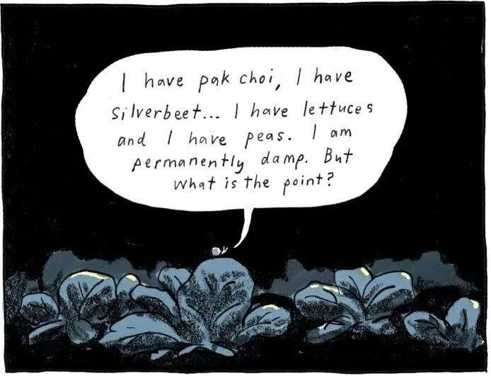 《新西兰地理》还为Ned创作了漫画,一只孤独的小蜗牛爬行在菜园中,自言自语道:“我有小白菜,我有瑞士甜菜……我有生菜,也有豌豆......我永远湿漉漉的......但是,这一切有什么意义呢?”