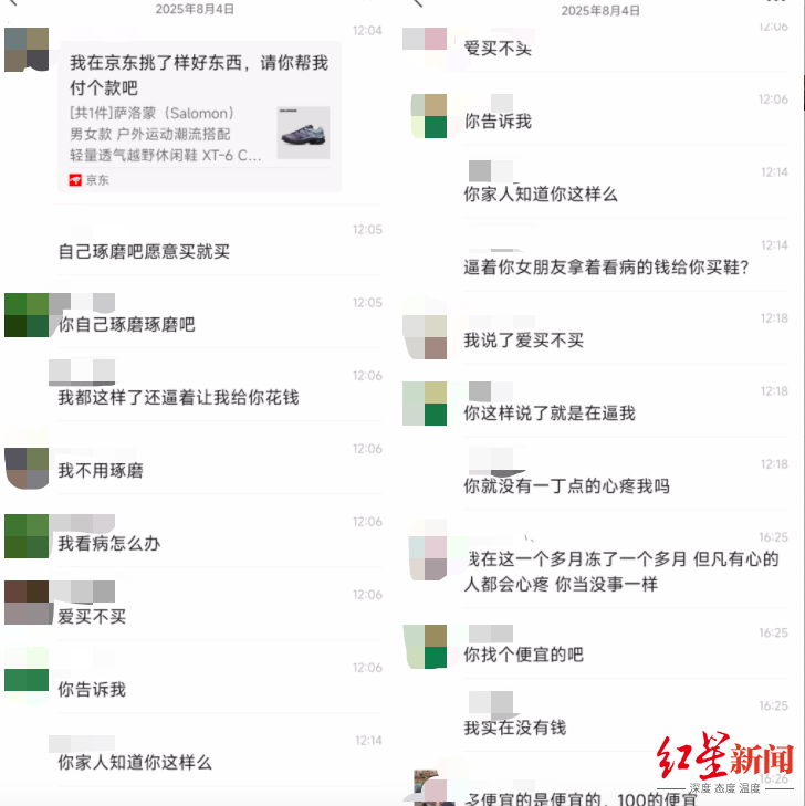 程女士提供的一段今年8月4日聊天记录显示:贾某发来一双萨洛蒙户外鞋代付链接,表示“自己琢磨吧愿意买就买”,程女士回复“你自己琢磨琢磨吧。我都这样了还逼着让我给你花钱”,贾某说“我不用琢磨”,程女士说“我看病怎么办”,贾某说“爱买不买”,程女士说“你告诉我,你家人知道你这样么?逼着你女朋友拿着看病的钱给你买鞋?”贾某说“我说了爱买不买”。在此之后两人联系减少。期间还互删过微信,平台账号也被男子拉黑。