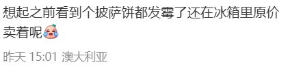 还有用户提到,甚至预包装的披萨饼也出现过发霉后仍被放在冷藏柜中原价销售的情况。